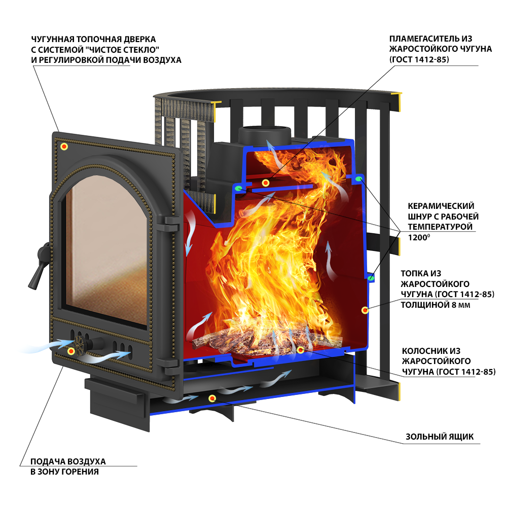 Надёжна и долговечна так как топка изготовлена из чугуна и состоит из трёх элементов. Между элементами, при помощи термостойкого герметика, прокладывается термостойкий керамический шнур. Элементы топки соединены между собой болтовым соединением, что даёт 100% гарантию безопасности при эксплуатации. Срок службы, заявленный производителем, до 30 лет.